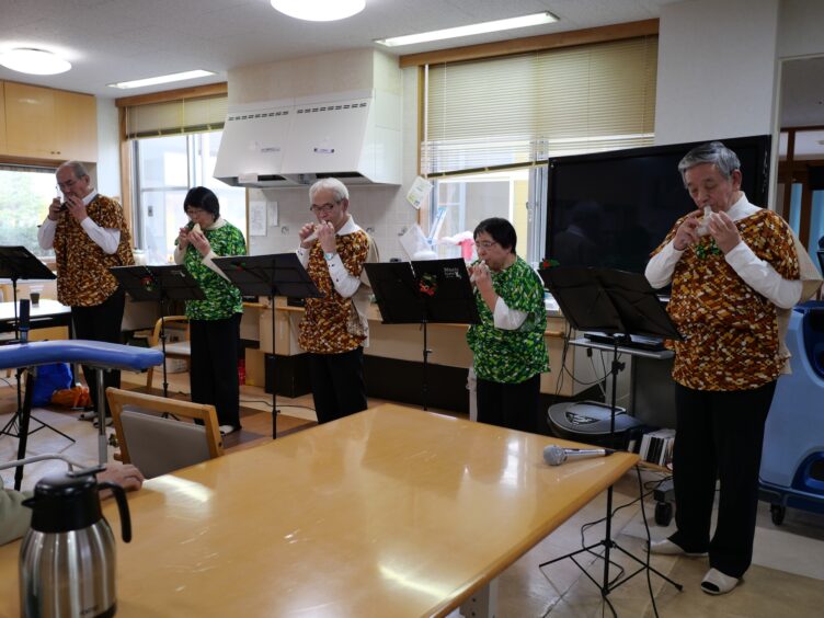 ブログBlog 医療法人 宏友会 > ブログ > 介護老人保健施設うらら > メリクリコンサート🎄🎅2025 メリクリコンサート🎄🎅2025 2025年12月24日 酒田を拠点に活動されているオカリナ演奏「コンパーニョ」さんが うらら通所リハの部屋を会場にクリスマスコンサートを開催して下さいました。 懐かしのナンバーを中心に演奏して下さり、ご利用者の皆さんも一緒に歌いました。 心温まるメロディ、皆さんも楽しめたようです✨。 ”オカリナ”についてもレクチャーして下さり、大変勉強になりました。 コンパーニョの皆さん、ステキな演奏、ありがとうございます。 また機会ございましたよろしくお願い致します✨。 介護老人保健施設うらら 最近の投稿 メリクリコンサート🎄🎅2025 ノーリフト研修会を開催しました。 メリクリ〜🌲 介護福祉士実務者養成課程 修了! 大盛況でした。もとたて冬支度ミニマルシェ、ありがとうございました。 冬のにおい 11/29 開催!もとたて冬支度ミニマルシェ 通所リハ恒例!芋掘り大作戦✨ 秋まつり 笹巻きづくり カテゴリー 上田診療所 介護老人保健施設うらら 在宅介護支援センターうらら うららホームヘルプサービス グループホームほなみ 酒田市地域包括支援センターほくぶ その他 アーカイブ 2025 2024